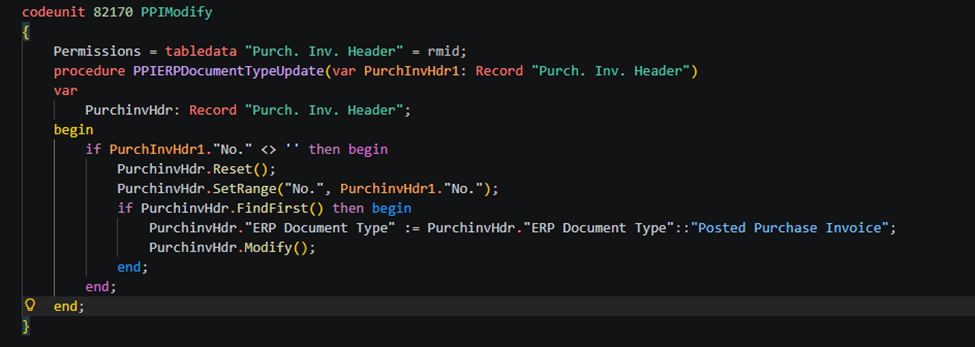 Since Business Central does not allow direct modification of posted documents in normal conditions, we must handle this requirement through AL development. For this, we write logic inside a codeunit, assign the required permission on the posted purchase invoice table, and then update the custom field programmatically in a safe and controlled manner.